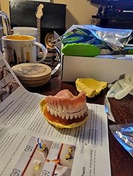 We ordered this kit after much research on Amazon and YouTube, reading and watching review after review. My husband and I had weight loss surgery over ten years ago and after so much nutrient loss, we are now losing our teeth. Most of my husband’s teeth need to be pulled and he needs full dentures, but everyone knows this is a very lengthy process. He just had most of his upper teeth pulled and already has no bottom molars. He has not been able to eat in months. He still needs more teeth pulled and now they are saying the only place he can go is almost 2 hours away. We don’t have the time or the patience to wait that long, so we ordered this kit and I am telling you if you are patient, watch the videos for the how-to aspect and have even the slightest bit of artistic ability, you can do this! I have been artistic my entire life, so this was a breeze for me. Getting the impressions just right is the tricky part. Anyway, the quality is amazing. And the price of making them yourself vs paying a dental bill is a major plus! If you have a good solid two days (one for each complete upper and lower) and lots of patience and a little artistic talent, this is the kit you want. My husband is pictured wearing the ones I made him. I still need to do a little tweaking on the fit (you can tell where I had to stop because one of the teeth they didn’t pull is still there – looking at the photo, upper right) but what’s great is you can always add more teeth down the line if you need to, which we most definitely will. Not only do they look real, you can eat with them too! Just stay away from anything too hot and don’t soak in effervescent tablets…remember this is moldable plastic – NOT acrylic dentures! They are pretty damn sturdy though! I am pretty damn proud of myself for making these! It’s a tedious process but SO worth it!! (Again, my photos are not final – I still have some tweaking to do, but they fit pretty good so far and look great!!)